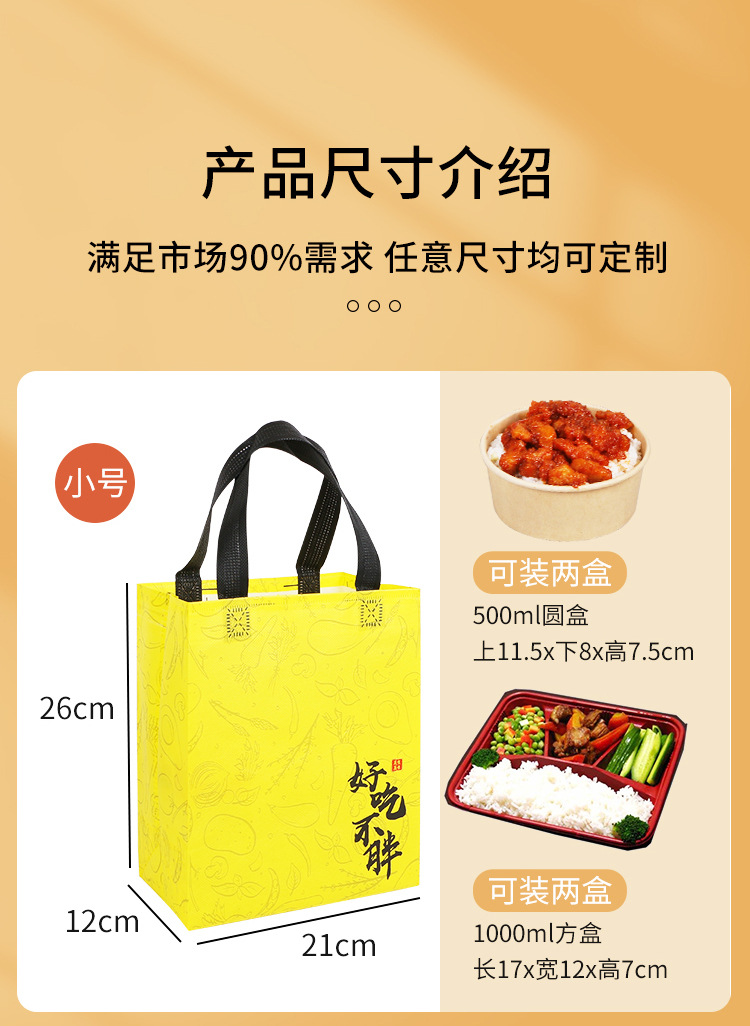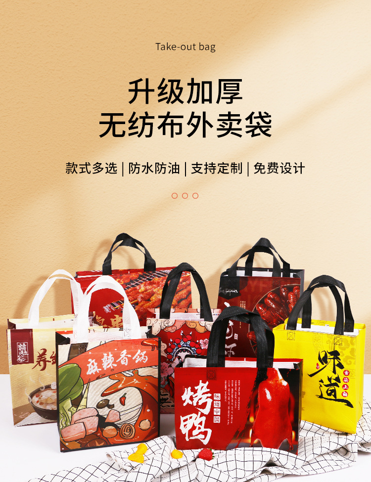 • 环保性:无纺布覆膜外卖袋是一种环保产品,客户在选择材质和设计时,应考虑到环保因素,尽可能选择可回收、可降解的材料。
