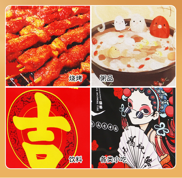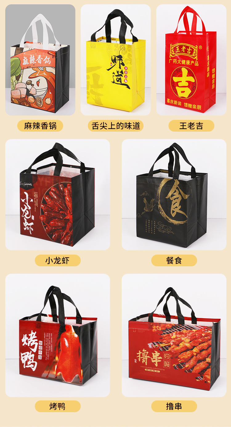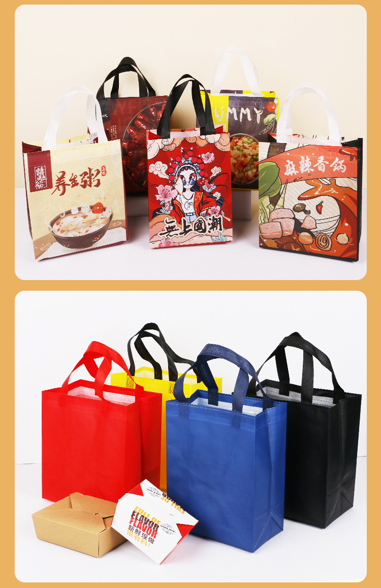 3. 材质选择:无纺布覆膜外卖袋的材质有多种选择,如PP无纺布、PE无纺布、复合无纺布等。客户需要根据使用环境和要求选择合适的材质。